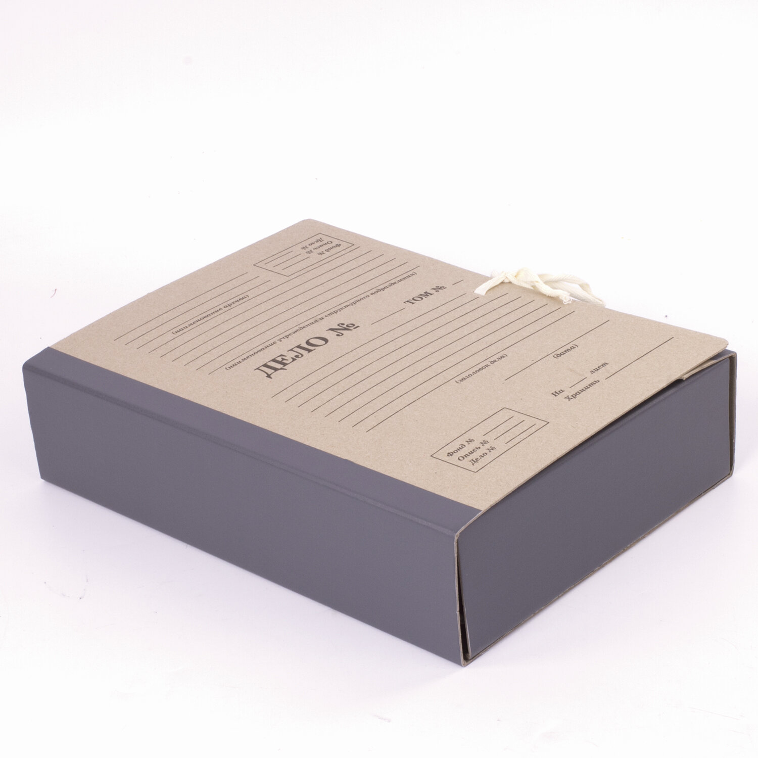 Папка стандартного формата А4 вмещает до 800 листов. Изготовлена из переплетного картона с покрытием из бумвинила. Ширина корешка составляет 80 мм. На лицевой стороне есть поля для подписывания. Закрывается с помощью 4-х тканевых завязок.