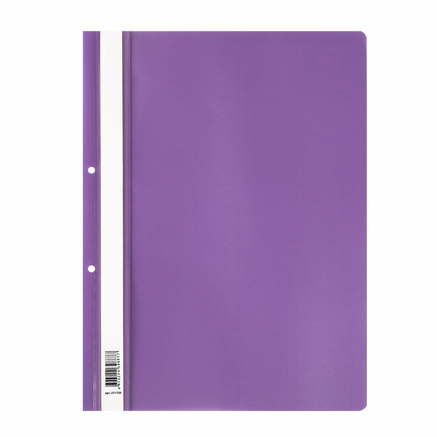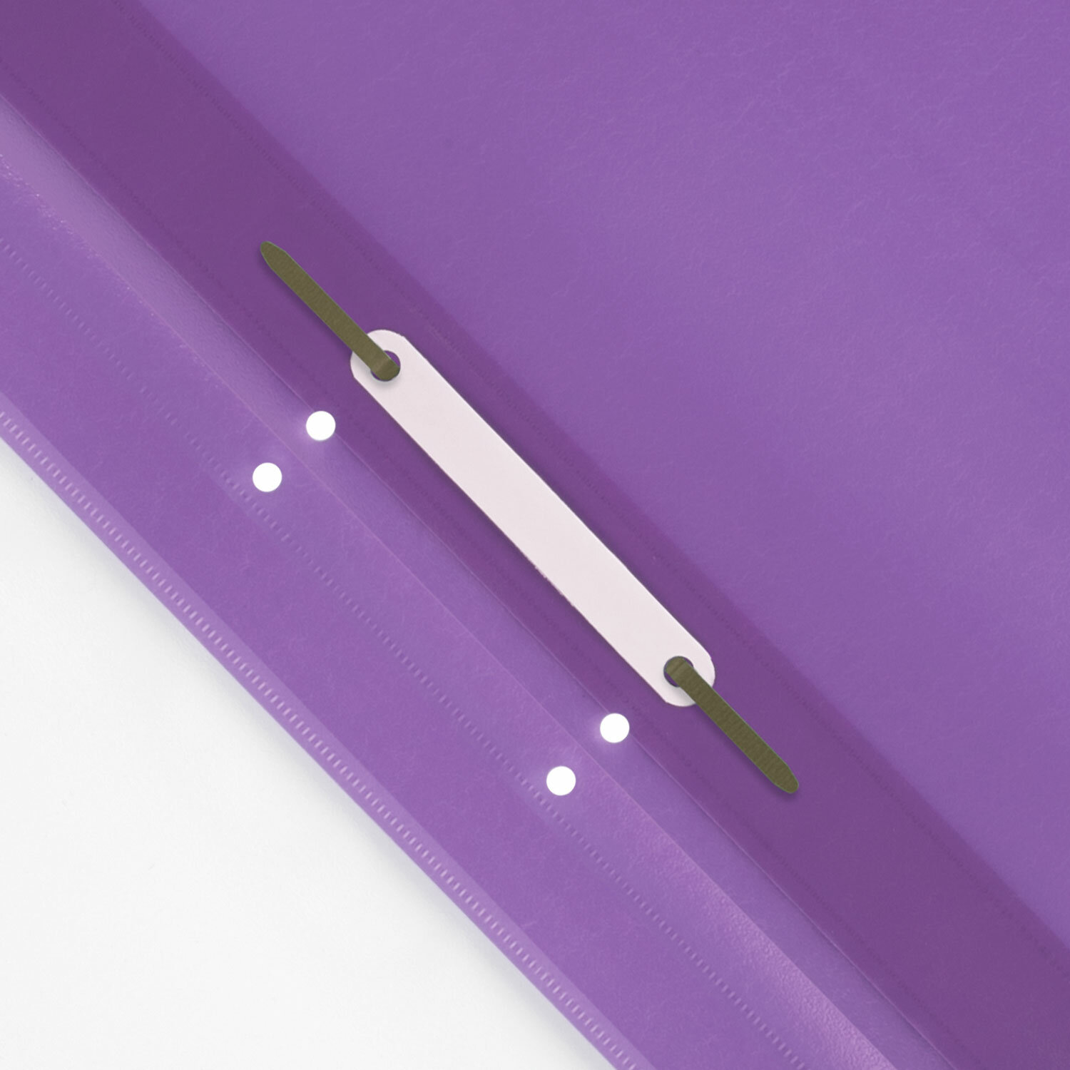 Фиксирует до 100 листов формата А4. Толщина пластика верхнего листа составляет 100 мкм, а нижнего - 120 мкм. Предельно простой механизм подшивки: металлические усики и пластиковая планка для надежной фиксации документов. Скоросшиватель изготовлен из качественного полипропилена. Прозрачный верхний лист позволяет определить содержимое, не открывая скоросшиватель, который к тому же снабжен сменным пластиковым корешком, что дает возможность структурировать информацию. Кроме того, корешок скоросшивателя снабжен перфорацией, что позволяет подшивать его в папки с любым механизмом. Благодаря насыщенному фиолетовому цвету обложки папка никогда не затеряется на полке.