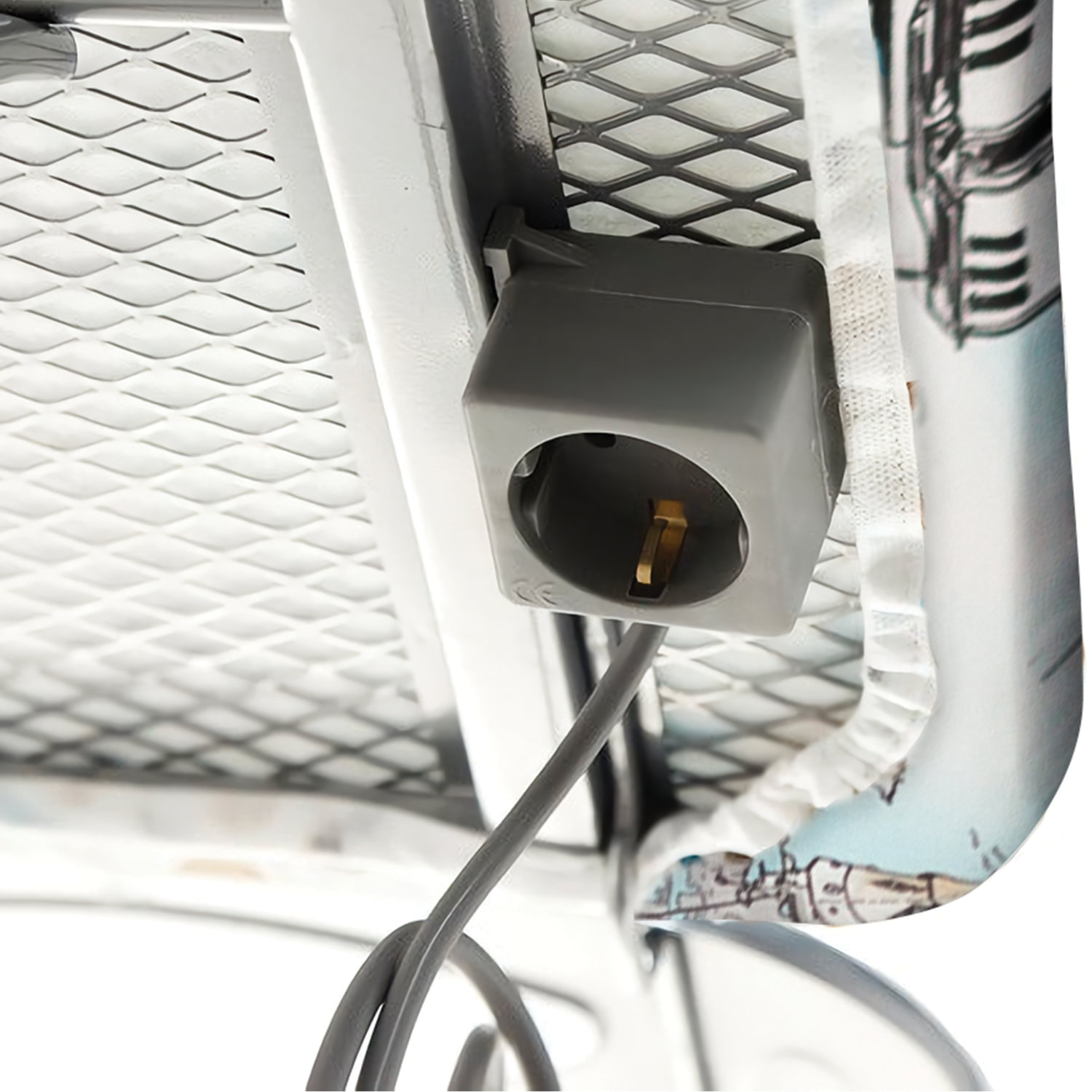 Длина рабочей поверхности: 120 см Ширина рабочей поверхности: 38 см Максимальная высота: 90 м Особенности: подставка под утюг с антипригарными силиконовыми вставками, розетка/удлинитель Вес: 5.8 кг Складная: да Материал корпуса: металл Материал рабочего стола: металл Материал чехла: 100% хлопок Цвет чехла: ассорти