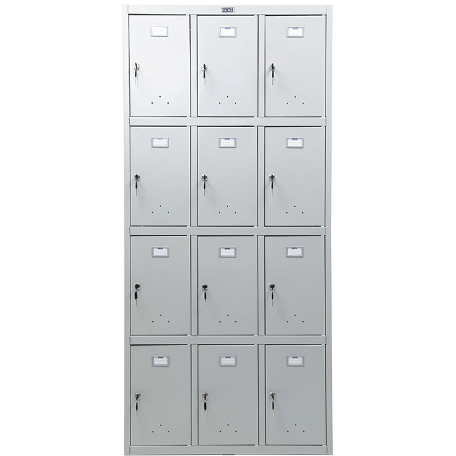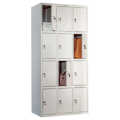 Габаритные размеры (ВхШхГ) - 1830х850х500 мм. Покрытие: светло-серая стойкая полимерная краска. Индивидуальный замок на каждое отделение. Блокировка ключа, при открытом замке. 12 независимых отделений. Скрытые внутренние петли устойчивые к взлому. Поставляется в разобранном виде, в компактной упаковке. Собирается при помощи винтов. Вес - 44 кг.