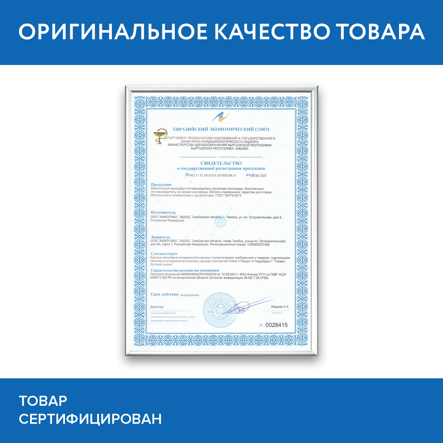СОСТАВ: более 30% кислородсодержащий компонент, 15-30% сода кальцинированная, 15-30% АПАВ, 5-15% мыло натуральное, менее 5% функциональные добавки.